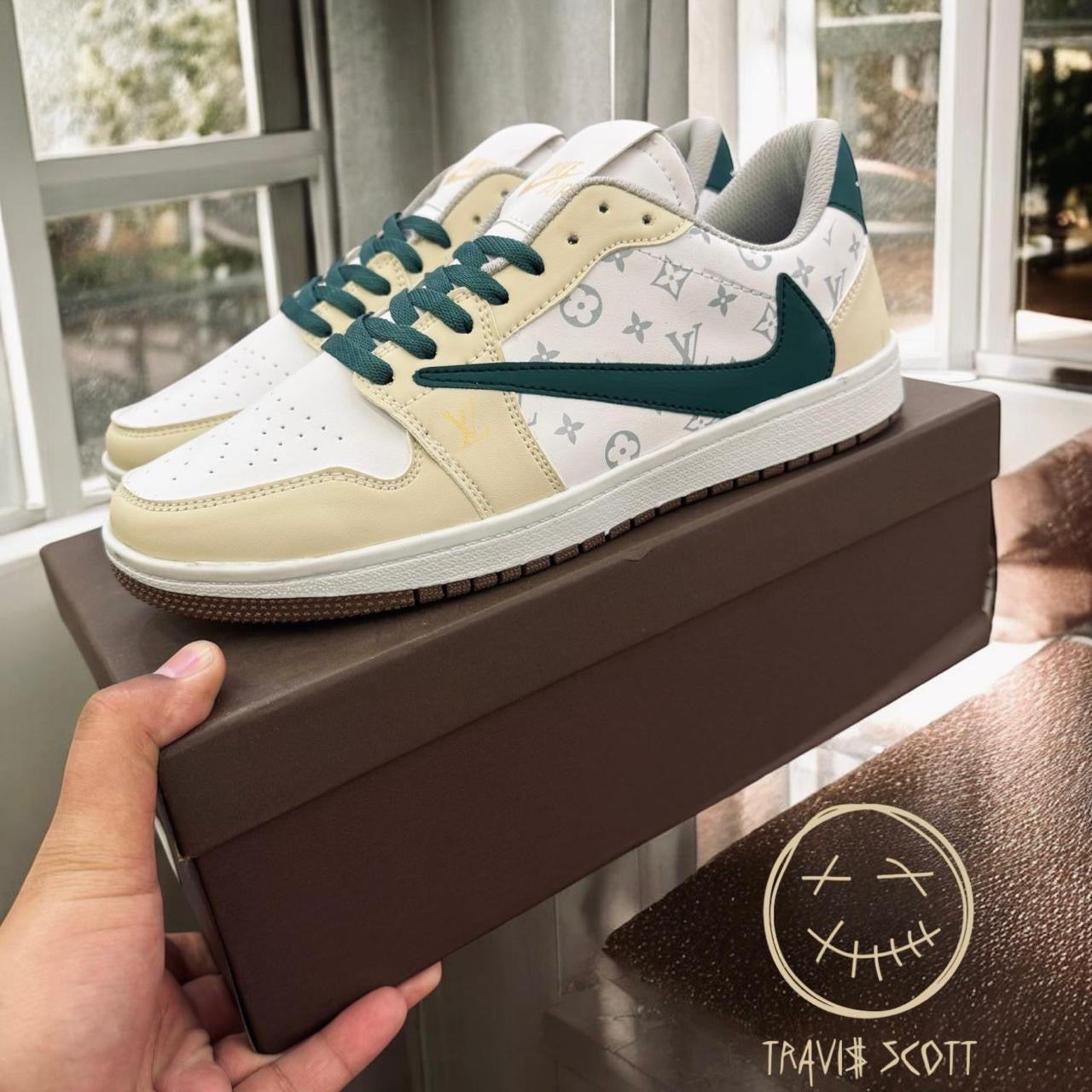 The Louis Vuitton x Travis Scott x Nike Air Jordan 1 Low is a high-end custom sneaker that blends luxury fashion with streetwear aesthetics. While not an official collaboration between Louis Vuitton and Nike, this design draws inspiration from Louis Vuitton's "Monogram Brown Damier Azur" Air Force 1 released in 2022, incorporating elements from Travis Scott's signature style .